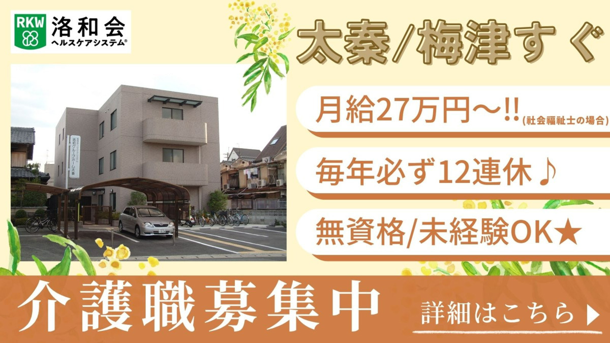 洛和 グループホーム 太秦では、家庭的で心地よい雰囲気の中で入居者様と心を通わせながら働くことができます。京都府京都市右京区太秦袴田町という歴史と文化の薫り高い場所で、地域とのつながりを大切にした介護を実践しています。入居者様一人ひとりに寄り添い、その方に最適なケアを提供することを目指しています。この温かい環境で、あなたの介護スキルを最大限に発揮してみませんか?
