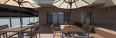広々としたテラスには日除けのパラソルも完備し、心地よい休憩が楽しめる空間があります。青空の下、ゆったりとした時間を過ごしていただけます。