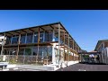 開放的なデザインが魅力的な新しい施設の外観です。働く環境として、清潔感と明るさが感じられます。