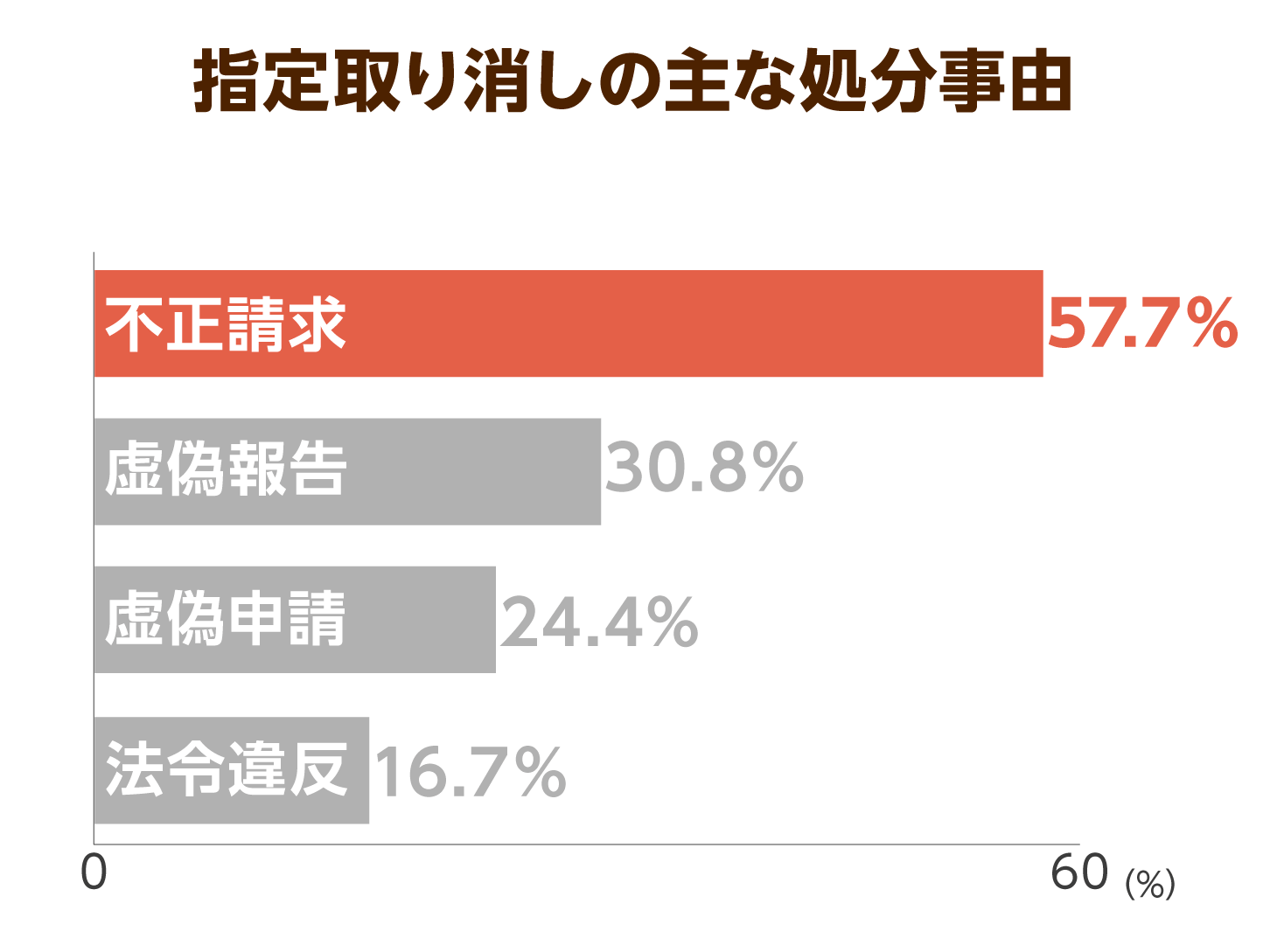 厚労省のデータによると、2019年度における「指定の取り消し」の件数を100とした場合、「不正請求」の割合が57.7%で最多となっています。