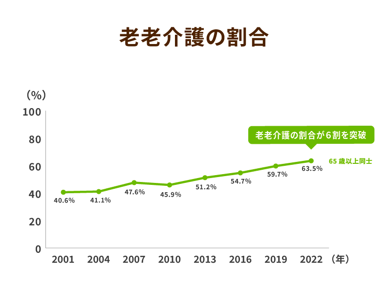 2022年に実施された「国民生活基礎調査」(厚生労働省)では、自宅で介護を行っている人々の中で、お互いが高齢者である「老老介護」の割合が、過去最多の63%に達したことがわかりました。
