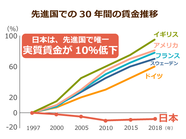日本は先進国で唯一、実質賃金が30年間減少し続けている