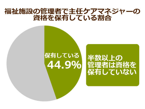 ちなみに、2016年度の調査によると、管理者で主任ケアマネージャーの資格を保有している割合は44.9%。半数以上は資格を持っていない状況でした。