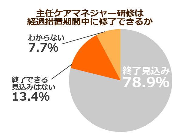 主任ケアマネージャーでない管理者が研修を修了できない(13.4%)、修了できるかわからない(7.7%)と回答していて、当初の3年間の経過措置では全体の約2割を超える事業所で、配置基準のクリアが難しい状況となっていました。