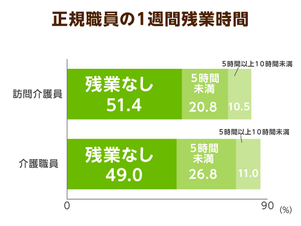 さらに、非正規雇用の場合では全体の65.9%が残業なしと回答。職業別では、訪問介護員が75.2%、ケアマネージャーが63.7%、介護職員が69.3%と、介護職員も7割近くが残業をせずに済む職場であることも明らかになっています。