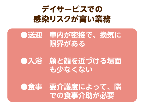 通所介護では多数の利用者に事業所まで来てもらい、入浴や食事、レクリエーションなどのサービスを提供します。そのため、営業中は毎日多くの利用者が出入りするため、感染者が混じる危険からは避けられません。