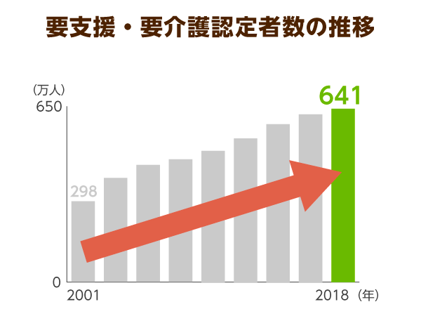 2019年に厚生労働省が公表した「介護保険事業状況報告」によると、要支援または要介護認定を受けた人の数は過去最高の641万人を記録。2年前と比較して、3万人の増加が見られました。