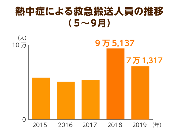 総務省の発表によると、2019年5~9月の熱中症による救急搬送人員は累計7万1,317人。2018年の9万5,137人と比較すると2万人以上減少しましたが、それでも約5ヵ月間に7万人以上が熱中症で体調不良を訴え、130人近くが死亡しています。