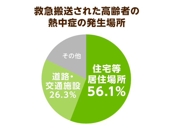 消防庁が2019年6~9月に行った調査によると、高齢者の熱中症での救急要請が最も多く発生した場所は「住宅等居住場所」(56.1%)で、全体の半数以上に上っています。